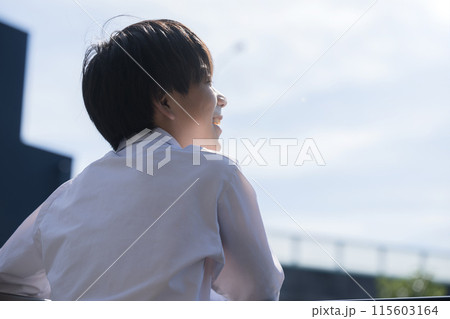 学校のベランダから進路を悩む空を見上げる中学生 高校受験や頑張る横顔の顔無しイメージ