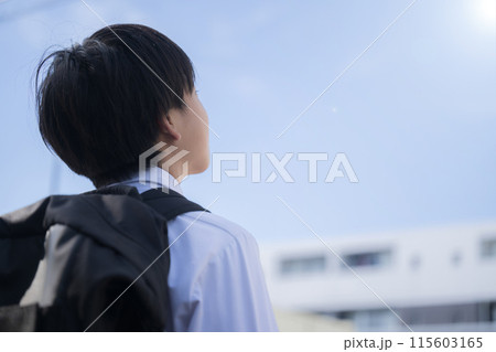 目標や希望に空と校舎を見上げる中学生 高校受験や頑張る顔無しイメージ