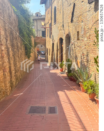 Child strolls down a narrow, brick-paved alleyway lined with rustic stone buildings and potted plants. The scene captures a peaceful moment in a historic setting. Italy, San Gimignano