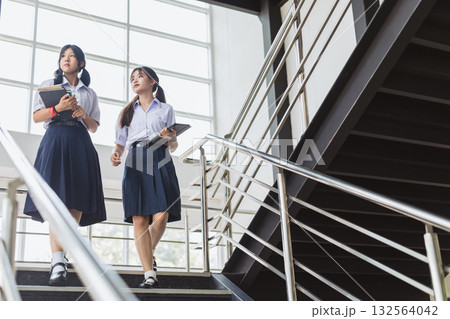 Smart students women teen in uniform standing together at modern school campus indoor.