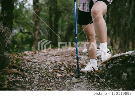Hiking action on mountain grass trail path. Close up of female hiker shoe. adventurous lifestyle of hiker and backpack to travel and trek mountain, enjoy every walk and hike part of thrilling journey