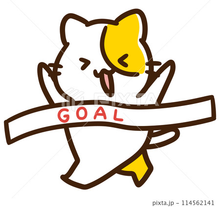 マラソンでゴールするかわいいねこのキャラクターのデフォルメイラスト