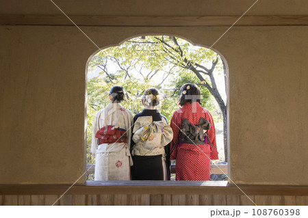 日本庭園で着物姿で会話をする20歳の女性と10代の女の子