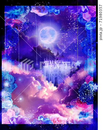 宇宙の中の御伽話の様なお城と月と星空の背景
