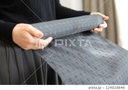 テーブルに広げられた着物の反物を巻く女性の手元 黒色の御召