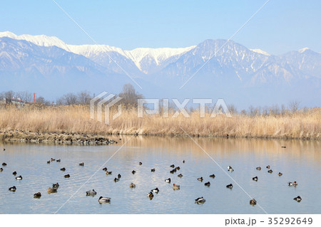 安曇野の冬風景 御宝田遊水地のカモと北アルプス