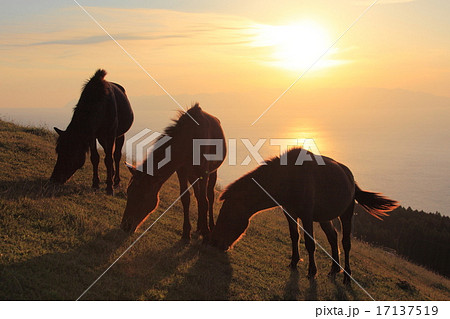 夕日と御崎馬 都井岬 宮崎県串間市