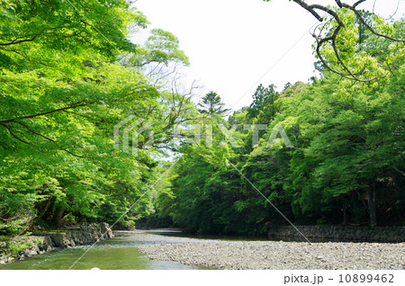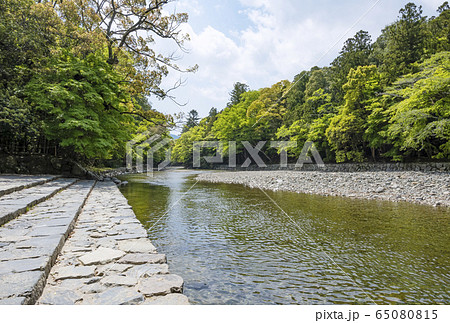 新緑の伊勢神宮 五十鈴川と新緑の風景 内宮の御手洗場 イメージ素材