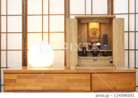 家具調仏壇(都市型仏壇)に納められた大日如来のスタンド型ご本尊 真言宗