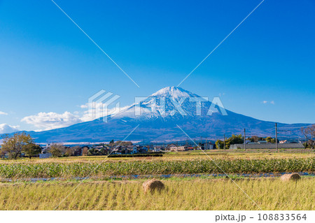 (静岡県)稲刈りの済んだ田んぼの向こうに富士山
