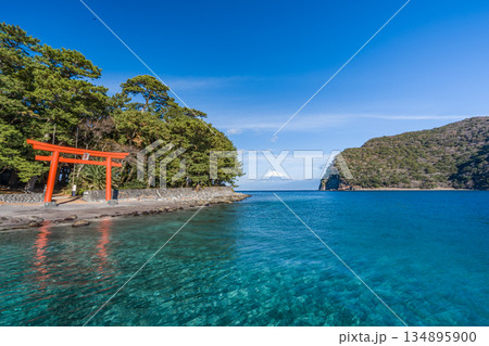 鳥居と駿河湾と富士山 「沼津市戸田 御浜」