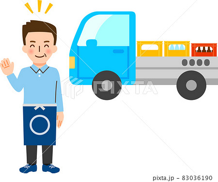 前掛けをした酒屋の男性と軽トラック、御用聞き