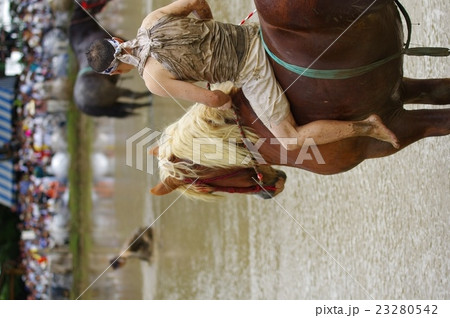 宮崎県美郷町西郷地区田代神社の980年の伝統行事の御田祭で神馬に乗り代搔きをする神事