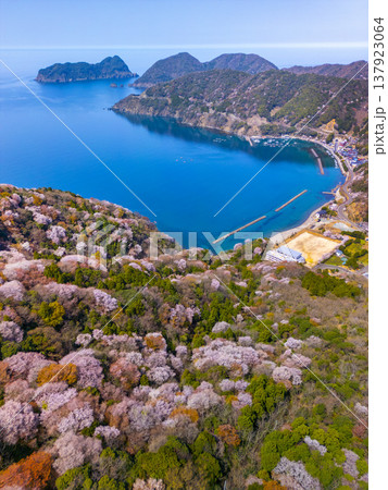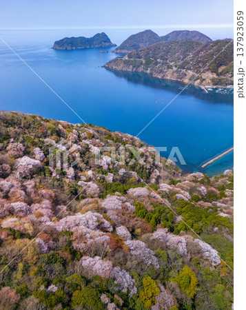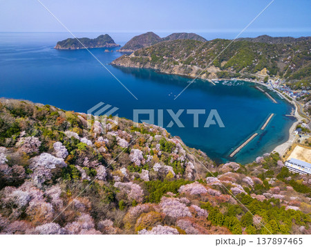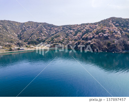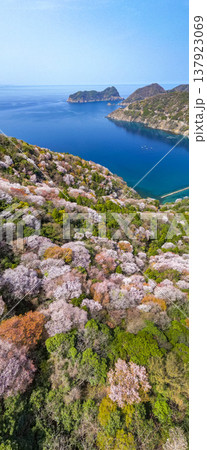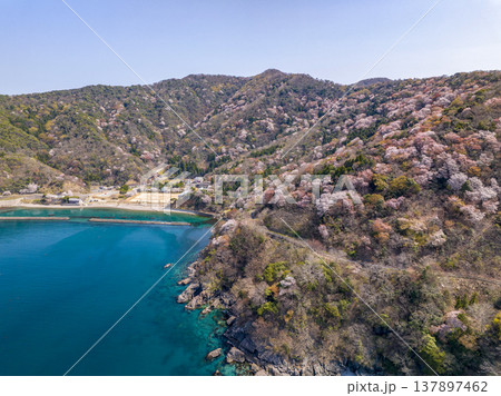福井県若狭町、神子の山桜の全景。日本海と山桜が織りなす春の風物詩。常神半島、ドローン空撮。