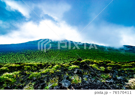 東京都大島町の伊豆大島にある火山三原山お鉢周りで見た雲や霧に覆われた裏砂漠と白石山