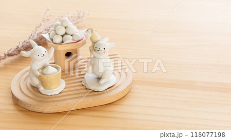 餅つきをしているウサギとお月見団子 お月見のイメージ写真