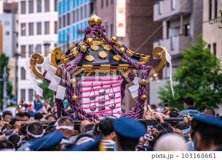 日本の東京都市景観 三社祭4年ぶり完全復活!雷門交差点で担ぎ手が交代し並木通りへ=5月21日・最終日
