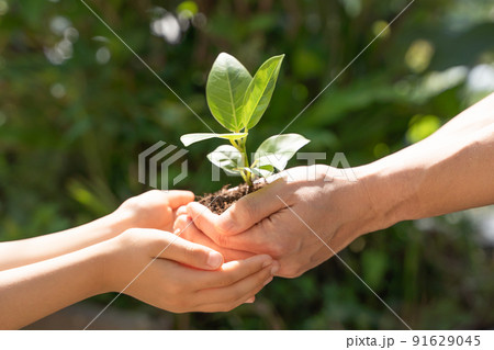 植物の苗を持つ子供の手