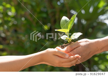 小さな緑の植物を持つ人々の手