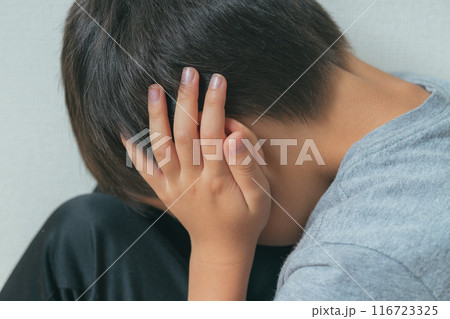 手で耳をふさいでうつむく男の子