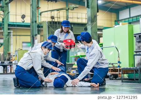 工場で倒れた作業員を発見し助けを呼ぶ女性作業員