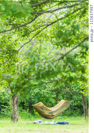 新緑の中の、ハンモックでくつろぐ