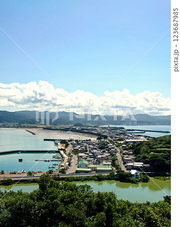 熊本県天草郡苓北町 天草四郎が率いる一揆軍の猛攻撃にも落城しなかった富岡城の遠景と麓の神社の鳥居