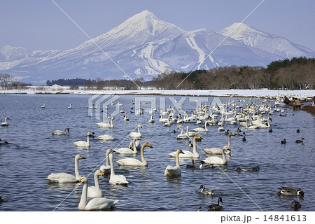 2021年12月の福島県の猪苗代湖から見た磐梯山と白鳥