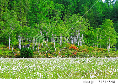 新緑の志賀高原の湿原にたくさんのワタスゲが咲く 田ノ原湿原は全盛期の朝の風景