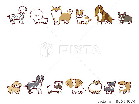 いろいろな種類のかわいい犬たちのイラストフレーム/木目調・横