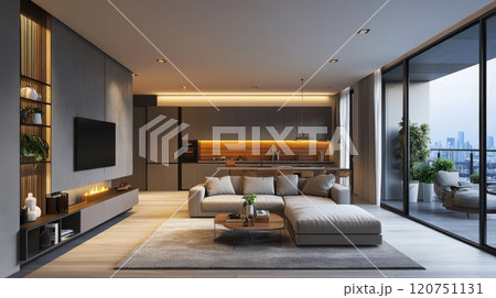 Modern luxury living room overlooking urban skyline with plush leather seating