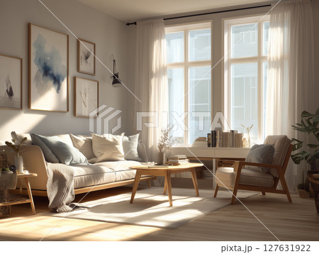 Modern Living Room with Large Glass Window and Comfortable Sofa in Bright Natural Light
