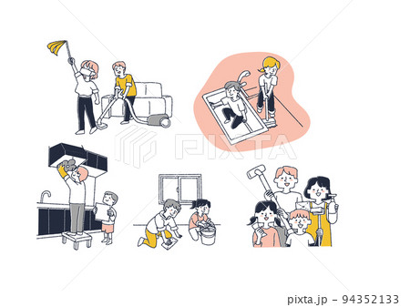 家族総出で大掃除をしている人々のイラスト コミカルな手書きの人物 ベクター、線画にカラー