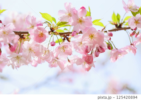 淡いピンクの思川桜のクローズアップ 【青空背景】 【空背景】