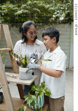 A busy Asian working woman mom is focusing on her work and taking care of her cute little son.