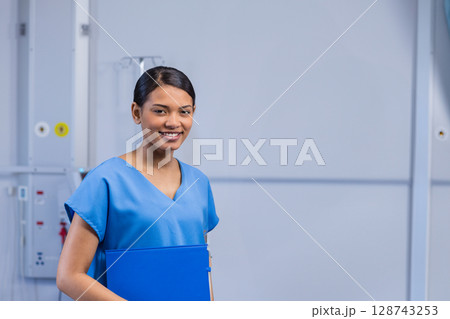 Young nurse smiling and holding blue folder in hospital corridor, next to medical panel, copy space