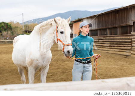 Armenian female worker takes horse out of stall, holds animal by bridle and leads pet for walk