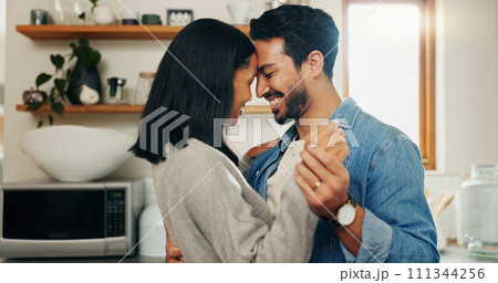Couple, dancing and kitchen with love for bonding and quality time in home. Romance, marriage and man or woman with movement for care with calm to celebrate happy relationship for partnership.