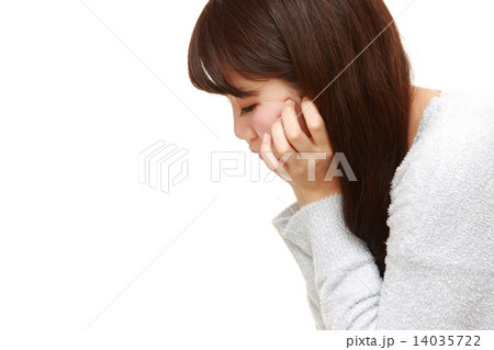 両頬を抑える白背景の困った顔の若い女性 肌荒れ