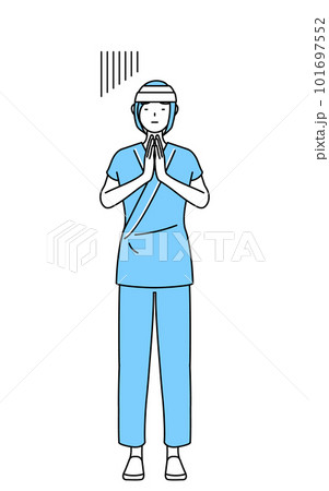 体の前で手を合わせて謝る頭に包帯を巻いた女性入院患者