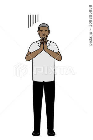 体の前で手を合わせて謝るアフリカ系シニア男性