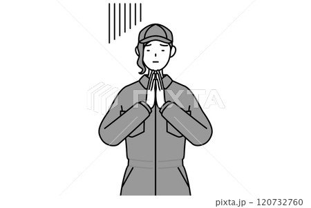 体の前で手を合わせて謝る帽子と作業着姿の女性