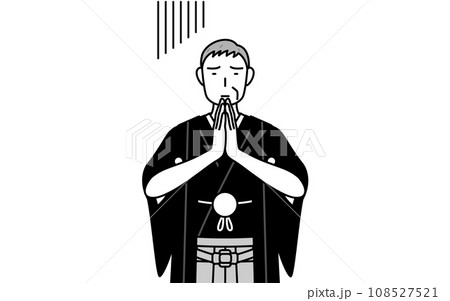 体の前で手を合わせて謝る紋付袴姿のシニア男性、お正月の初詣や結婚式で