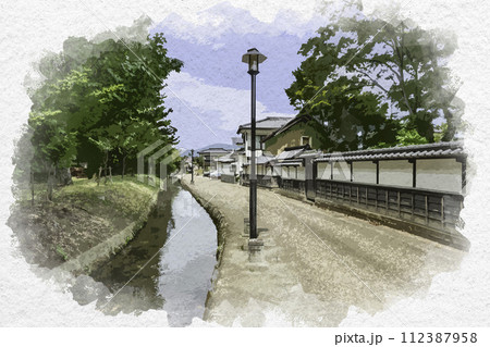 水彩画風 松代 竹山町の水路 長野県長野市