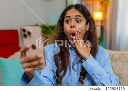 Indian woman reacting wow expression to unexpected good news on smartphone while at home on sofa