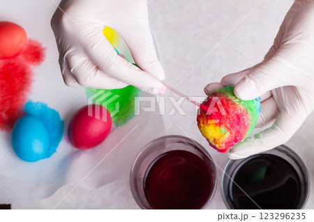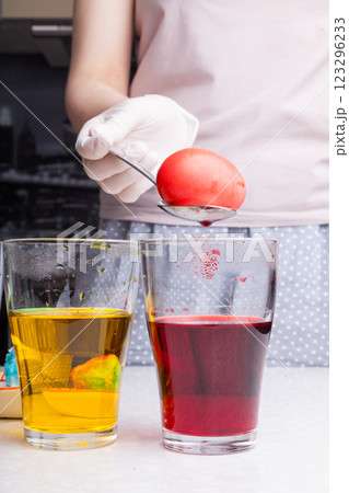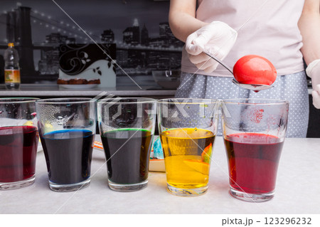 Preparing for Easter - coloring eggs in home kitchen female hands in rubber gloves use spoon take boiled egg out of glass with diluted red dye next other glasses different colors with submerged eggs.