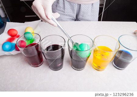 Preparing for Easter - coloring eggs in home kitchen female hands in rubber gloves use spoon take boiled egg out of glass with diluted blue dye next other glasses different colors with submerged eggs.