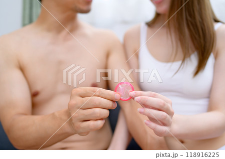 避妊具着用を勧める女性と断る男性 コンドームを持つ若い女性の手 夫婦 妊活 性的同意