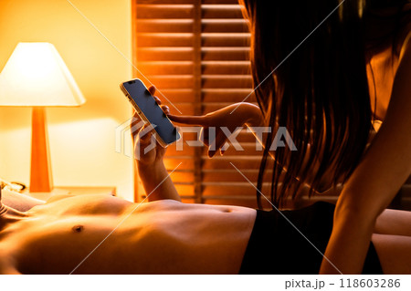 スマホで性的同意の確認をスマホで求めるカップル 女性から男性に同意を求める 性行為の明確な意思確認