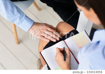 Sexual Harassment At Work. Businessman Harassing Woman Colleague Touching Her Knee Working Sitting In Office. Cropped, High-Angle